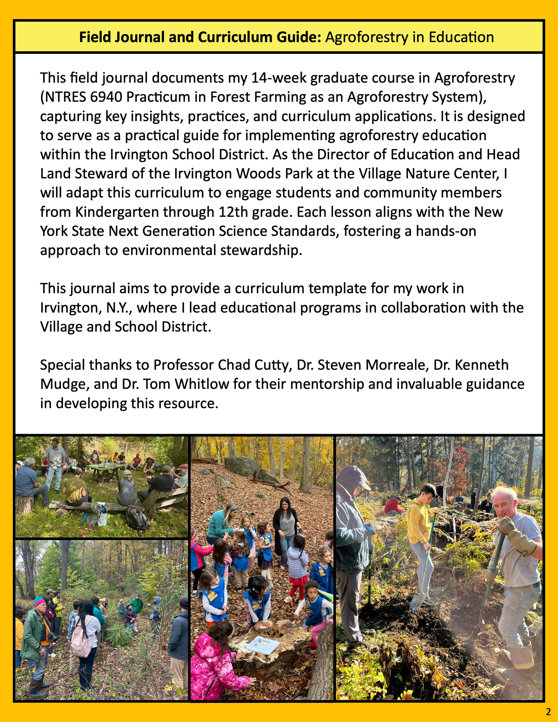 This field journal chronicles my 14-week graduate course in Agroforestry (NTRES 6940: Practicum in Forest Farming as an Agroforestry System), highlighting key insights, practices, and curriculum applications. It is designed as a practical guide for implementing agroforestry education within the Irvington School District.