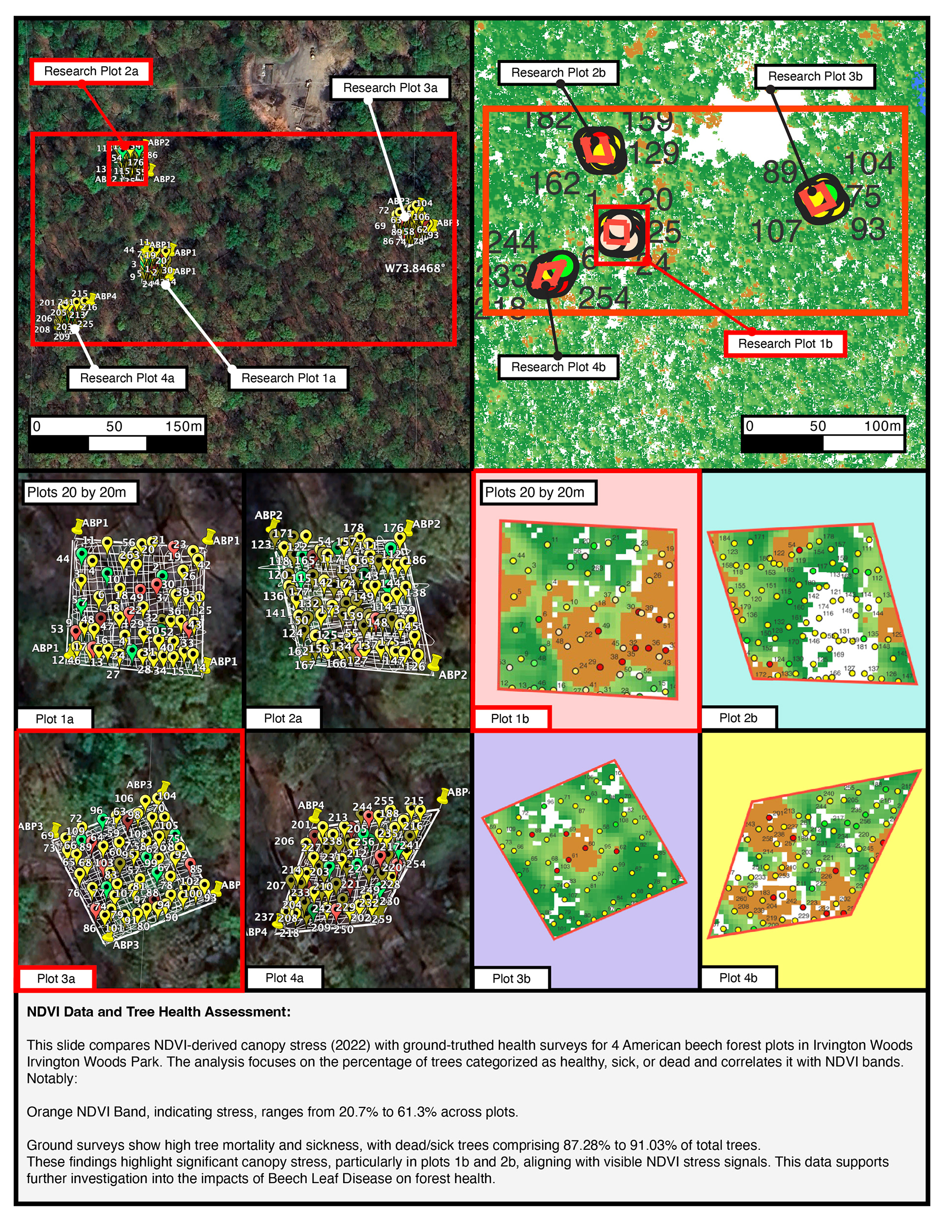 This research project analyzes the forest health of Irvington Woods Park (251 acres) using NDVI (Normalized Difference Vegetation Index) mapping and field surveys. The study focuses on assessing canopy stress, tree mortality, and the impact of Beech Leaf Disease on the parkβs ecosystem.