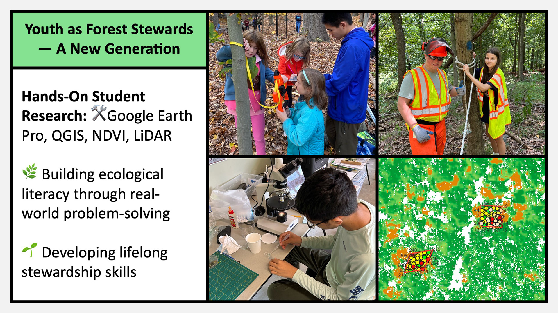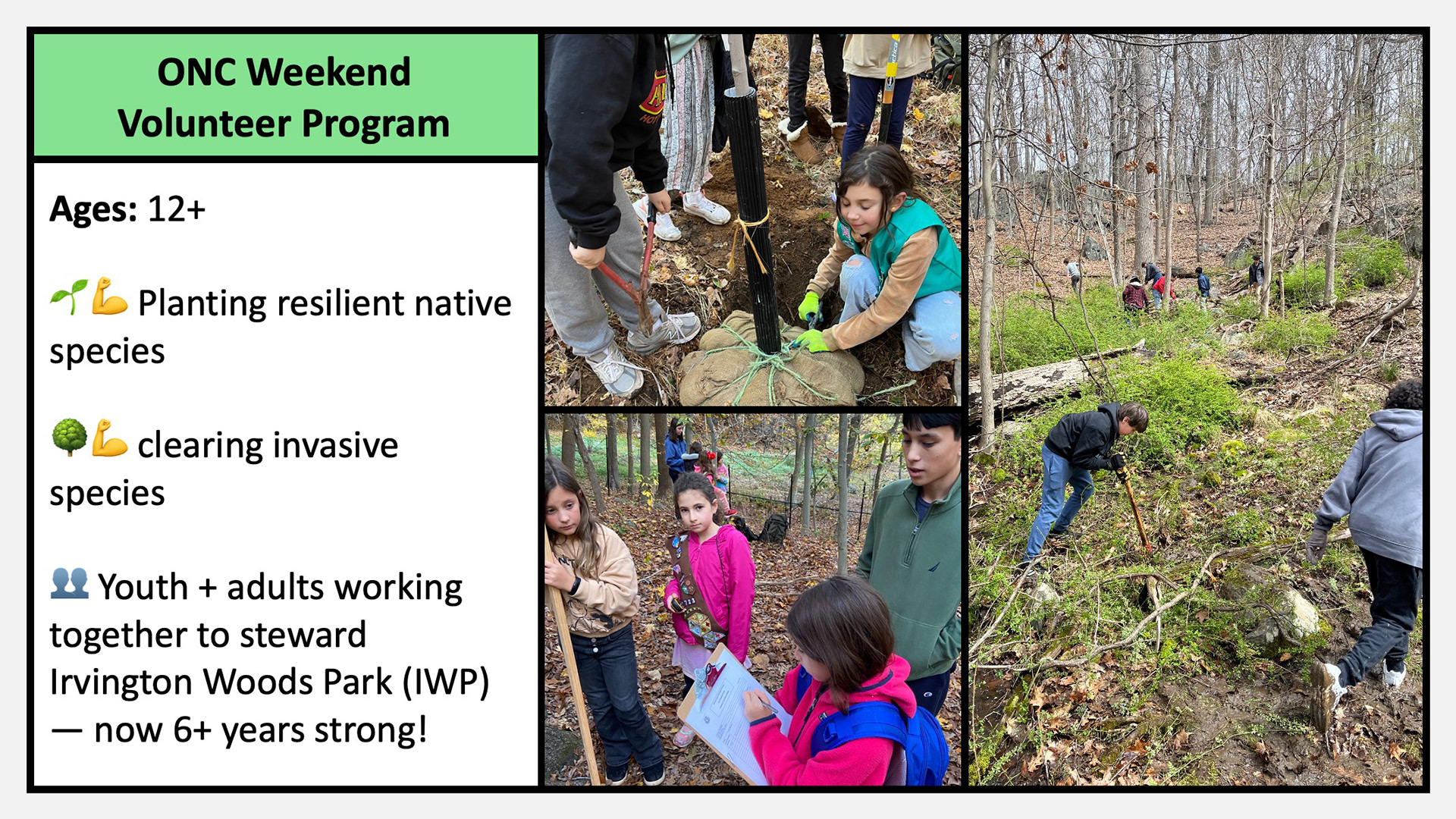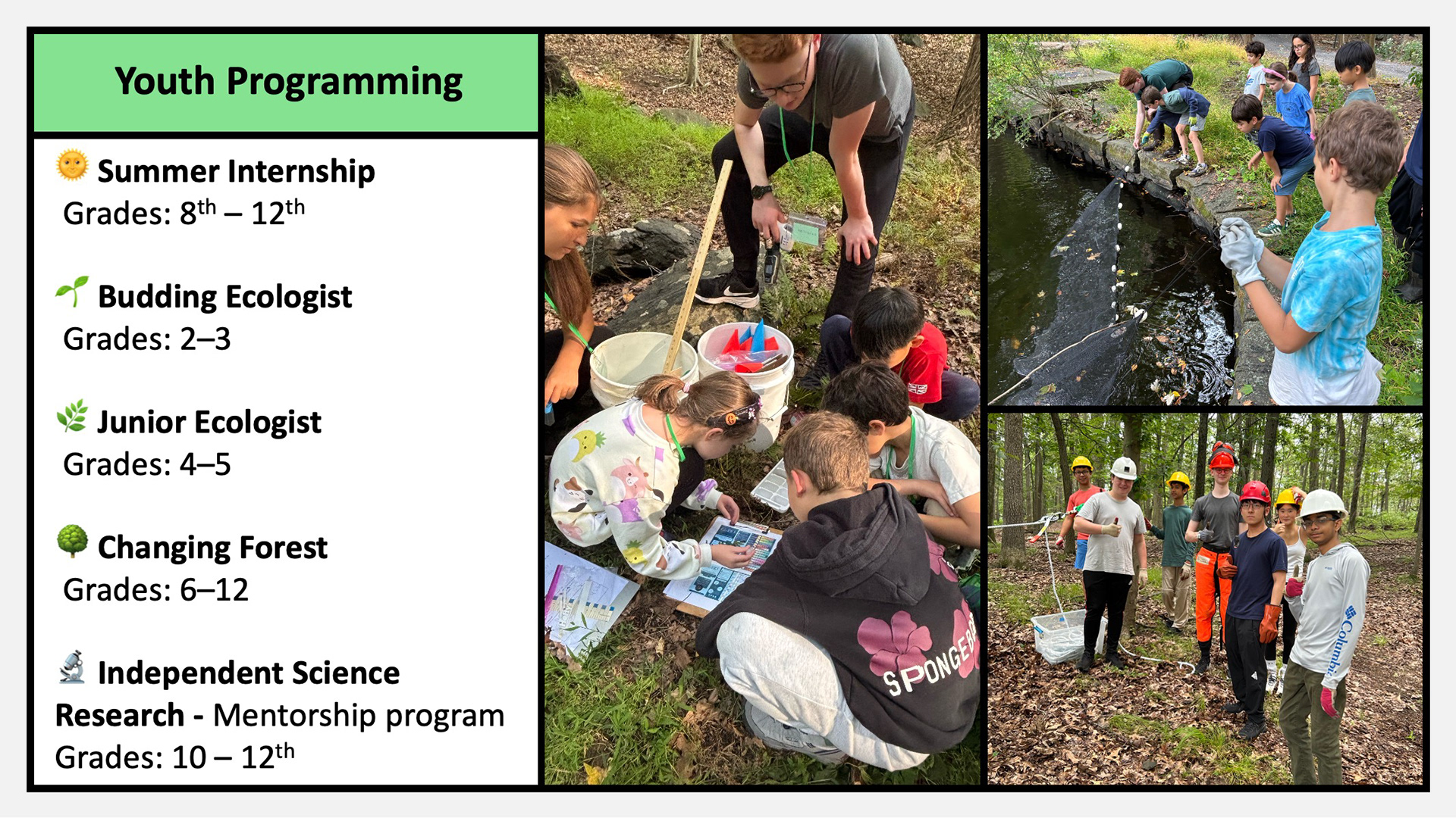 These environmental science and ecology field programs engage community members of all ages in hands-on learning and civic stewardship within Irvington Woods Park. From kindergarten through adult education, participants build skills in field biology, GIS and remote sensing, conservation science, soil ecology, maple sugaring, and community-based restoration. Structured pathways include Budding Ecologist (Grades 2β3), Junior Ecologist (Grades 4β5), Changing Forest (Grades 6β12), a Summer Internship (Grades 8β12), and Independent Science Research mentorship (Grades 10β12). Together, these programs cultivate a knowledgeable volunteer base that understands the forestβs needs and takes meaningful action to protect and restore this unique ecosystem, helping secure more than $500,000 in restoration grants and contributing to national recognition of Irvington Woods as an Old Growth Forest.